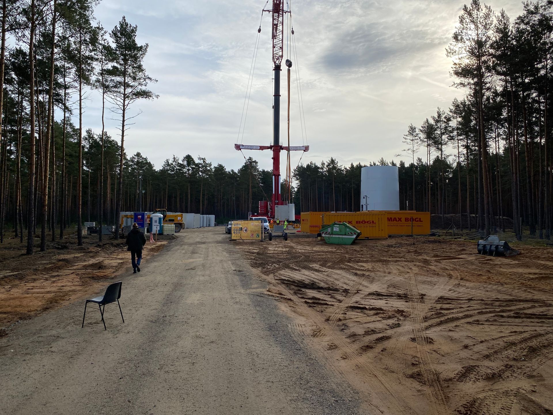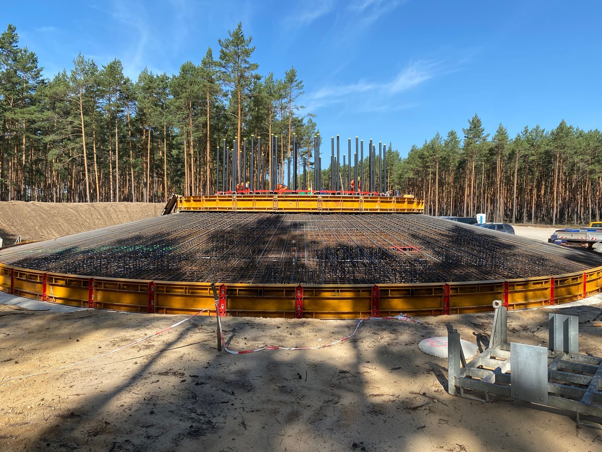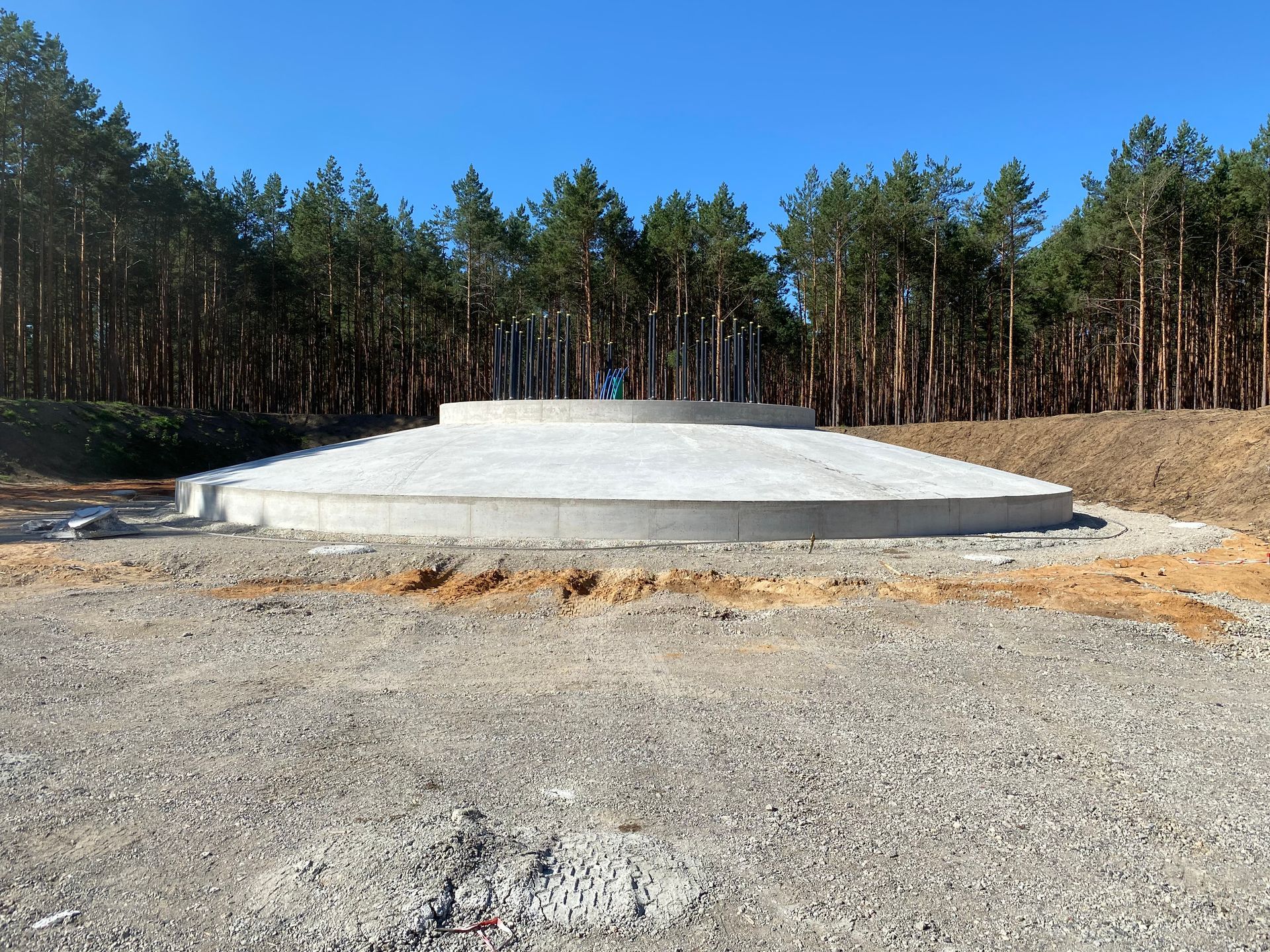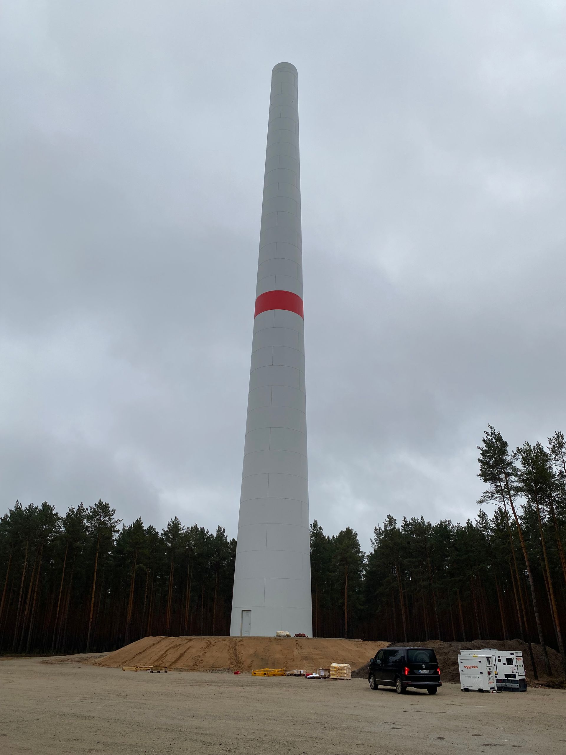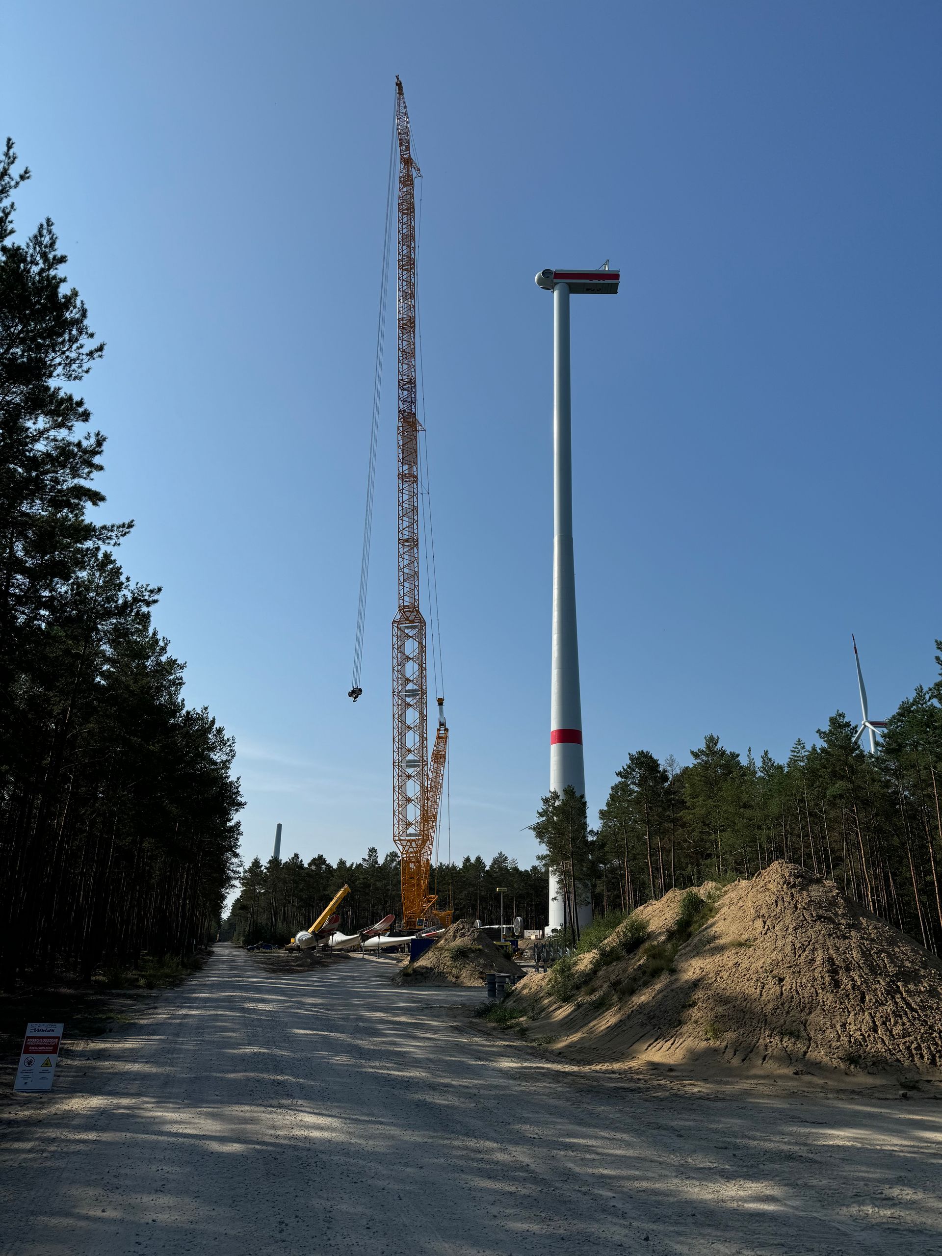 Stand September 2024: Der Betonturmbau ist an allen 9 Anlagen abgeschlossen. Seit Juni läuft die Anlagenendmontage durch die Fa. Lewandowska. Dabei werden die 3 Stahlturmsegmente, das Maschinenhaus, der Generator, der Triebstrang, Hub, sowie die Rotorblätter montiert. Für die Montagearbeiten kommt ein Radkran LG 1750 der Firma Liebherr zum Einsatz.